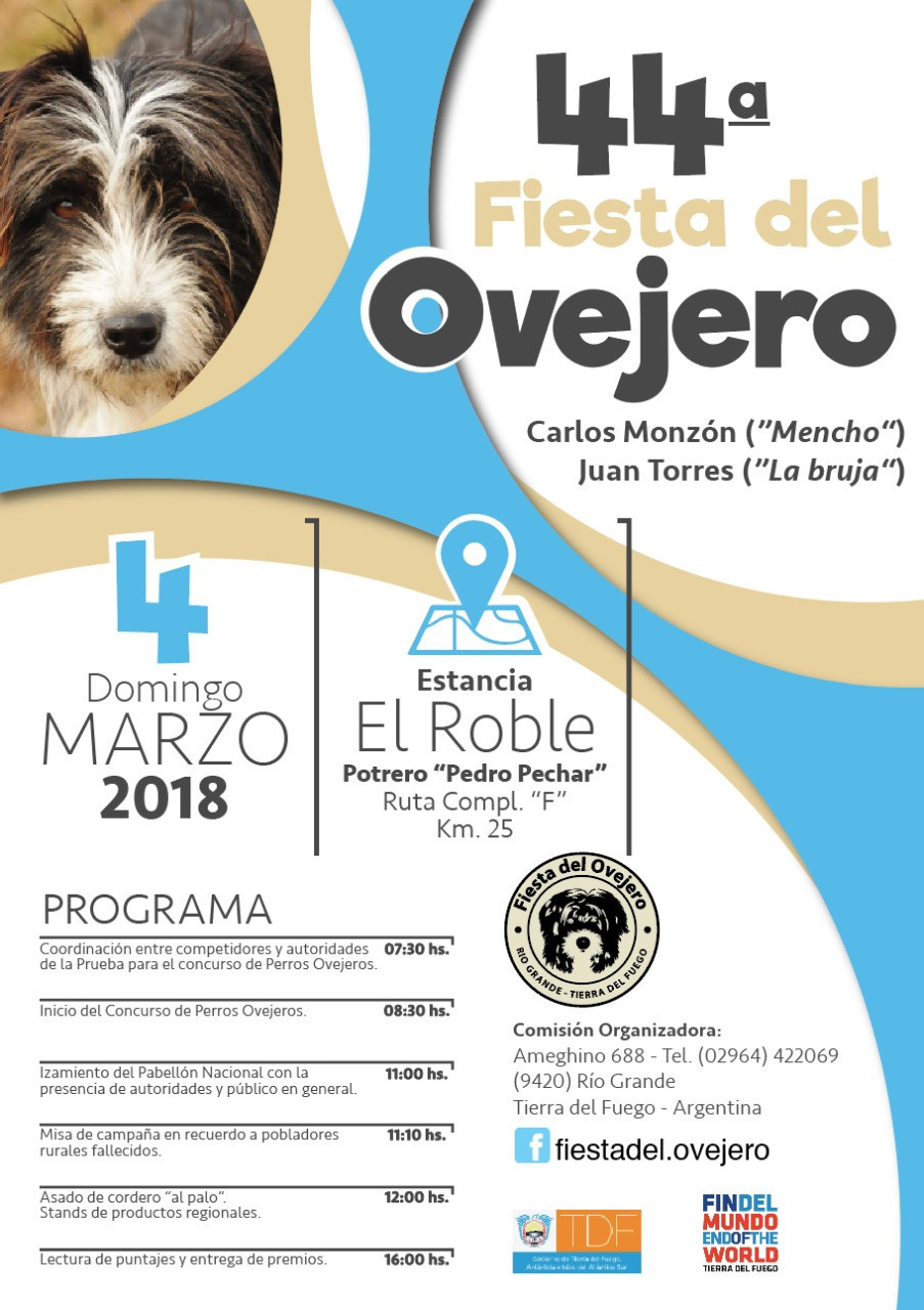 El Instituto Fueguino de Turismo y la Comisión organizadora de la Fiestas Provincial del Ovejero invitan a los vecinos y visitantes a participar de la 44º Edición que se llevará a cabo el domingo 04 de marzo, en el Potrero Pedro Pechar de la estancia El Roble, ubicado en el Km 25 de la ruta provincial Nº 9.